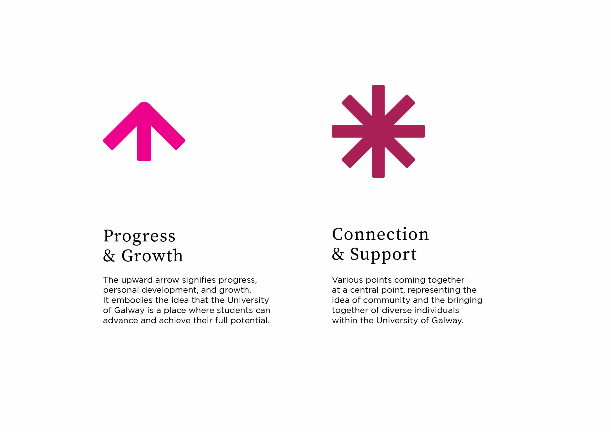 The asterisk (or star) icon represents Connection & Support, while the upward arrow symbolises Growth & Progress, two core themes that reflect the spirit and purpose of the University of Galway’s welcome programme. These visual cues work together to reinforce the programme’s message and values at every touchpoint.