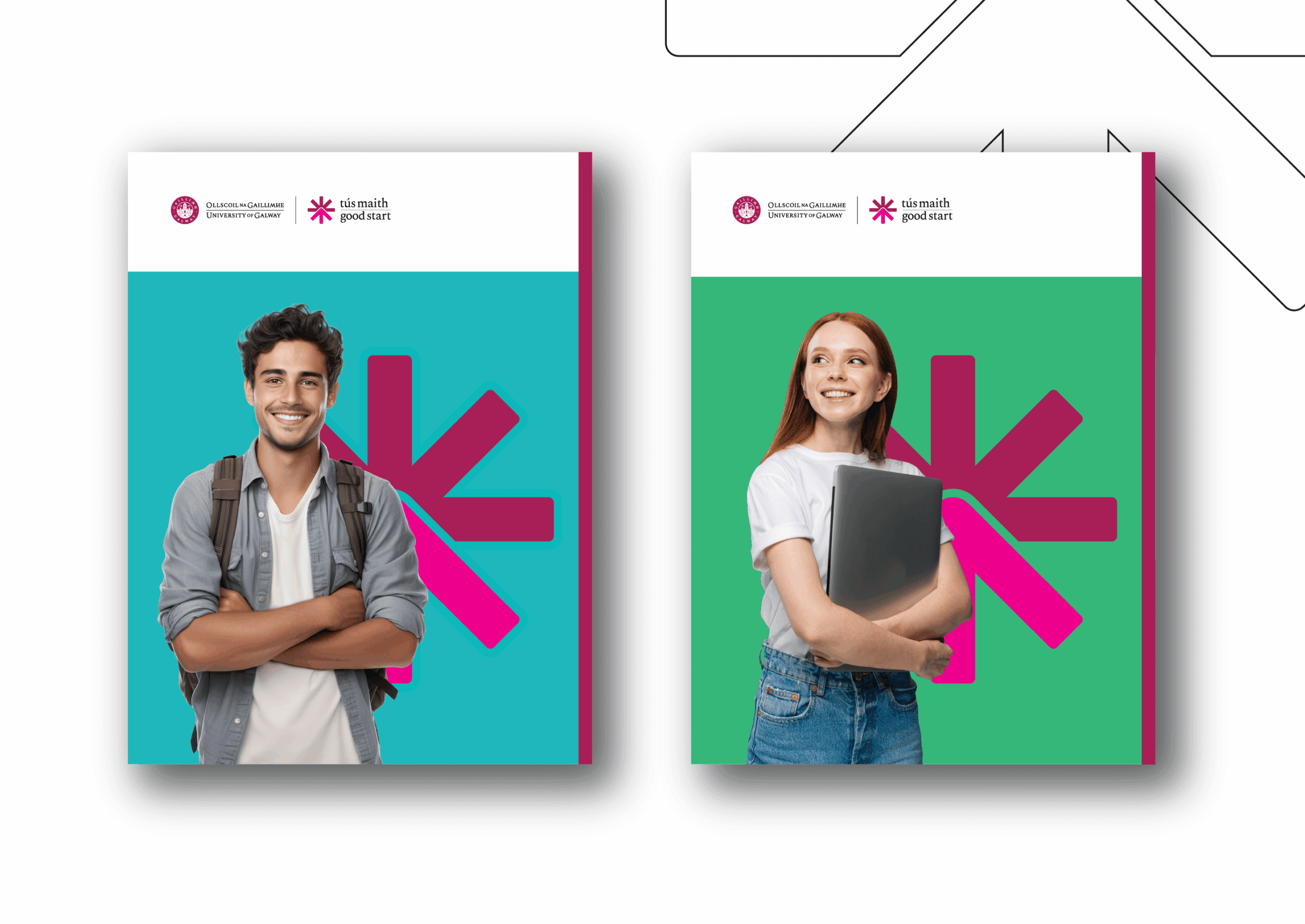 The Tús Maith | Good Start brand identity is designed to create a supportive and inclusive first impression for students, offering a warm welcome into university life. It fosters connection through engaging experiences that help students build relationships and feel part of the University community from day one. At its core, Tús Maith empowers students, equipping them with the knowledge, confidence, and tools to take charge of their academic journey and thrive at the University of Galway.